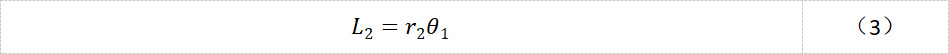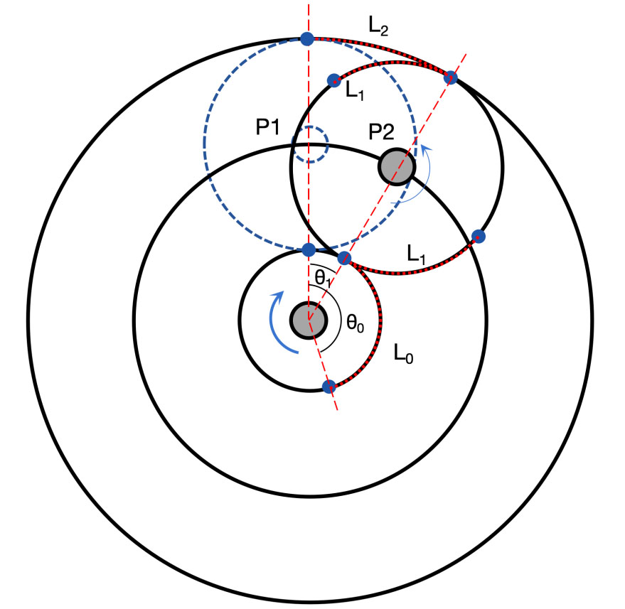 图3展示了太阳轮旋转θ0角度时,带动行星轮从P1位置移动到P2位置,行星架转动了θ1角度,其中,太阳轮和行星架顺时针旋转,行星轮逆时针旋转。在图3中,用红色的虚线圆弧标注了太阳轮、行星轮、内齿圈齿轮啮合的轨迹,长度分别是L0、L1和L2,显然有: