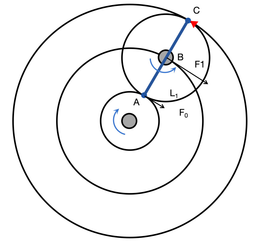 这时的行星轮可以看成一个杠杆ABC,支点在C点,在A点输入力F0,在B点输出力F1应为F0的两倍,那么: