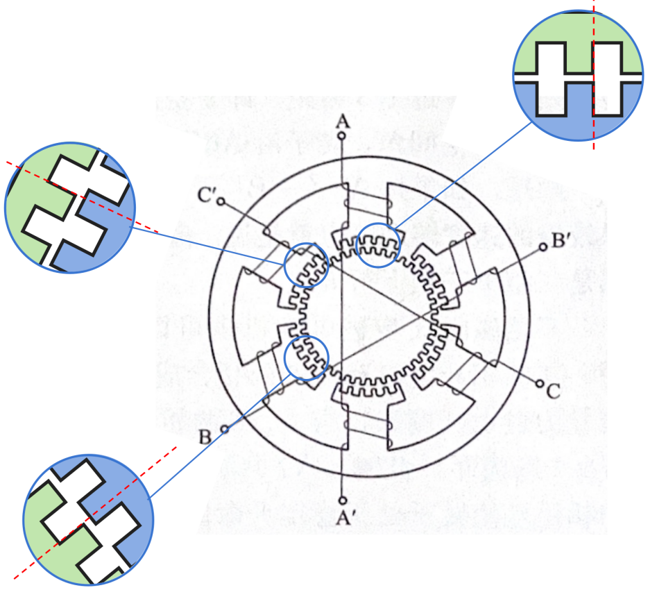 可以看到转子上的齿与其中一相(A)定子齿对齐时,与其他两相(B/C)的定子齿总是交错的(如图 所示),这个交错的角度分别为1/3齿(3°),这种设计的用意我们放在下面步距角原理处解释。