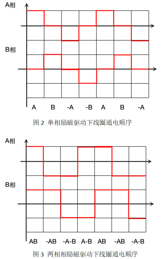 如图1所示,单相励磁驱动下,A/B两相线圈按照A_B_A-_B-_A的顺序依次通电,每一次通电,电机转子便移动一个步距角,如此循环,电机便实现了连续的旋转运动。而A/B两相电流的情况如图2所示。若是两相励磁,那么两相通电情况如图3所示。