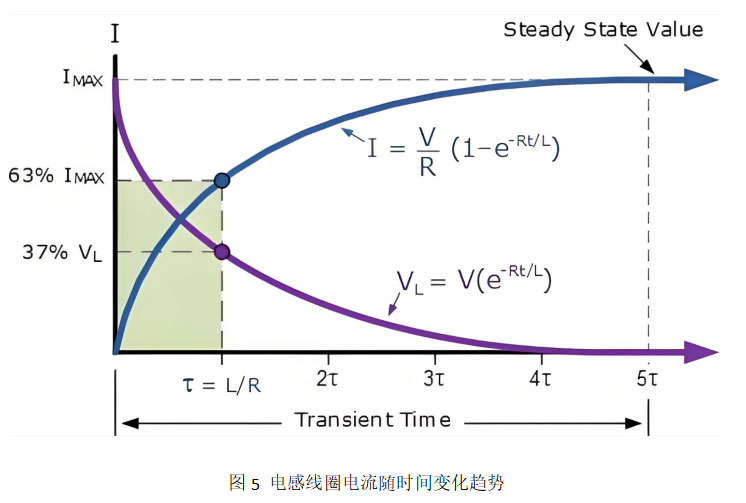 线圈不仅具有电阻,还具有电感。电感是一种抵抗电流变化的特性——当电压施加到线圈两端时,电流不会瞬间跳变到稳态值U/R,而是按照以下公式逐步上升: